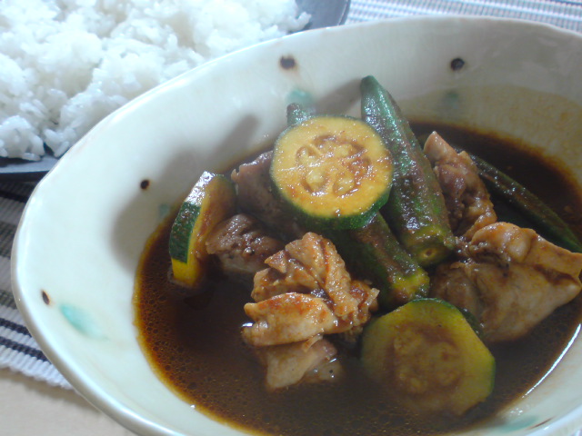 ゴロゴロのチキン、オクラ、ズッキーニ、ナスのカレー。