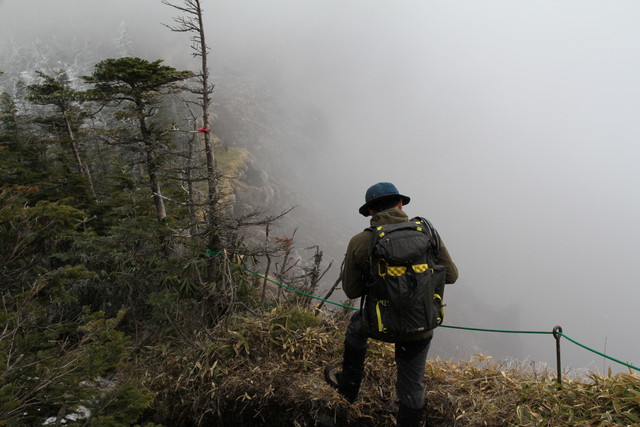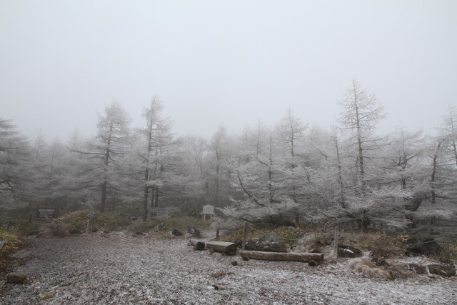 運が良ければ雲上の景観を見ることのできる黒斑山の頂きも、さすがに今日は晴れずじまい。いやいや参った。途中、口を開く余裕もなかった。死ぬかと思った。