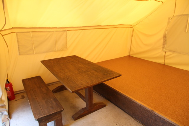 室内に入ってみると、かなり明るいせいか、テントと聞いて想像していたような閉塞感は全くない。手前の土間部分には4人掛けのテーブルセットと薪ストーヴがあり、小上がりの部分は大人4~5人がゆったり寝れるほどのスペースと荷物置きの棚がある。