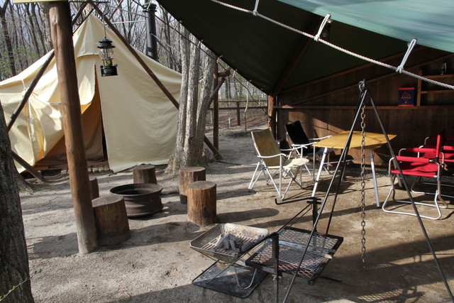 テントは、厚手のテント地を、切り出した檜の丸太で吊ったワイルドな造り。二重のスクリーンは、まだ寒さの残るこの時期、頼りになりそう。