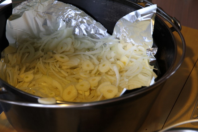 ダッチオーブンでは、塩豚のロースト。500gくらいの豚の肩ロースの塊を2個、塩の量は普通で、全体にまんべんなく擦り込み、今回は2日ほど冷蔵庫で寝かせて持参。玉ねぎはたくさん、5~6個。にんにくはこぶし大の一株をスライス。ネットで少し底上げしたアルミホイルの上にこれでもかと敷き詰め、表面に少しきつめに焼きを入れたロースの塊を並べる。
