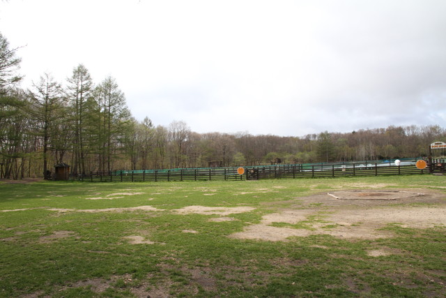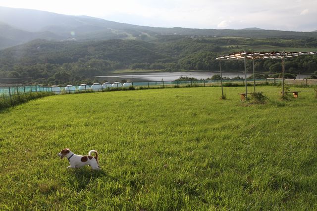 で、目の前の木立を抜けた先、キャビンから1分もかからないドッグラン・・というか、放牧場だよね、まるで。牛?いや、犬ですけど、まぁ、大喜び。よく手入れされたドッグランは、小型犬用と中大型犬用に分かれていて、柵の幅木の間隔もそれに合わせて変えてある。犬の目線で閉塞感を感じさせず、けど脱走兵もなしよ。配慮を感じます。