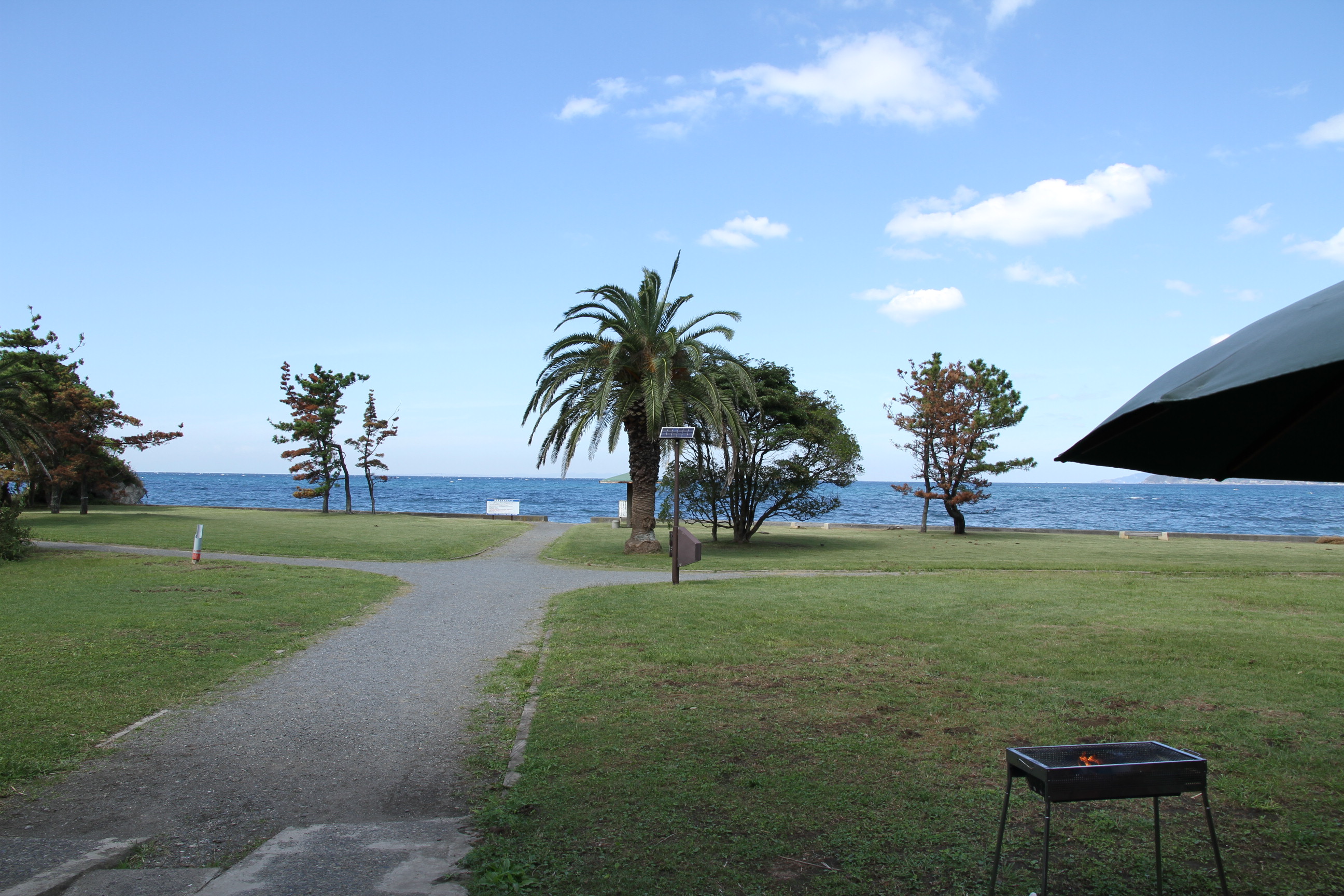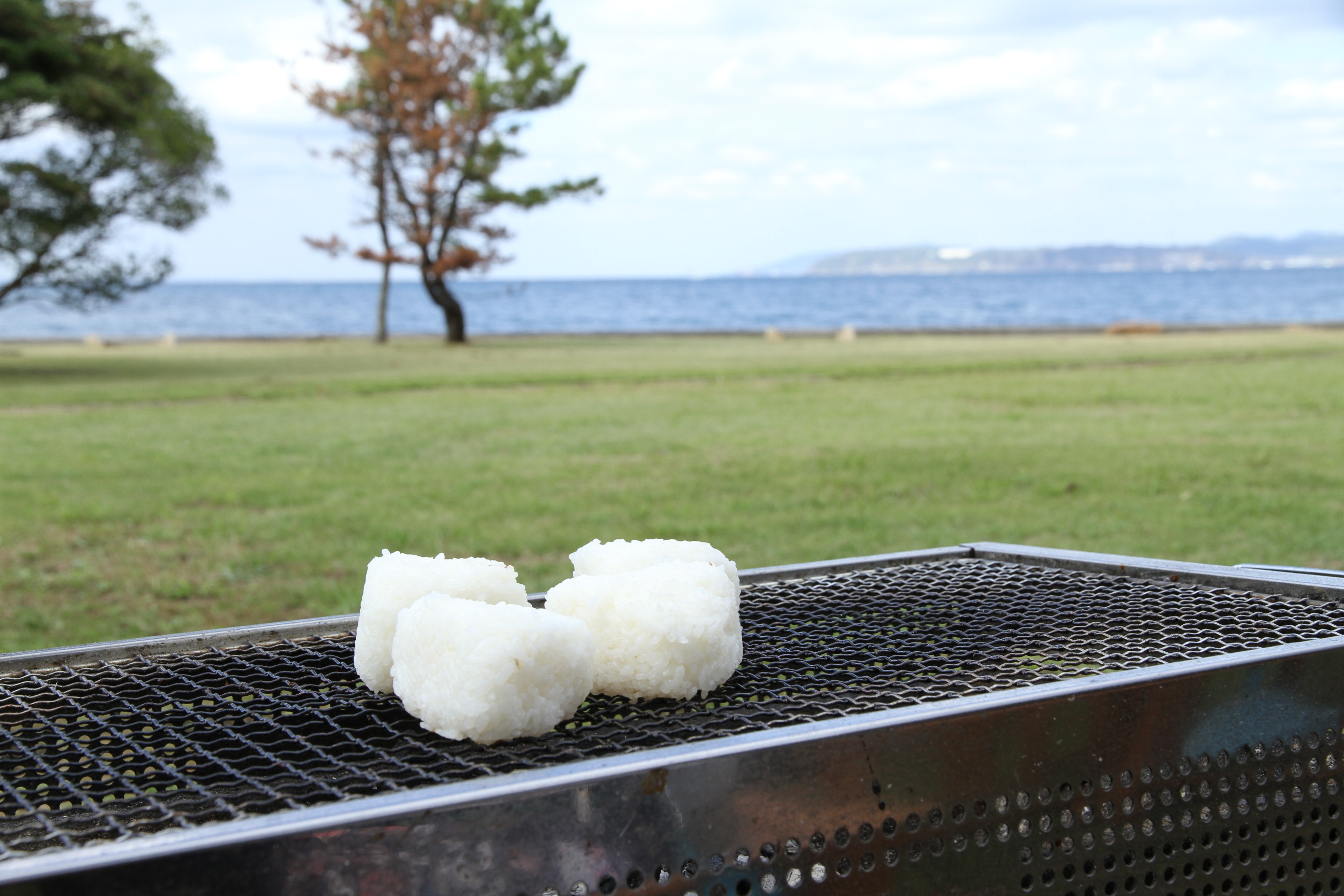 焼きおにぎりのバックに海~。