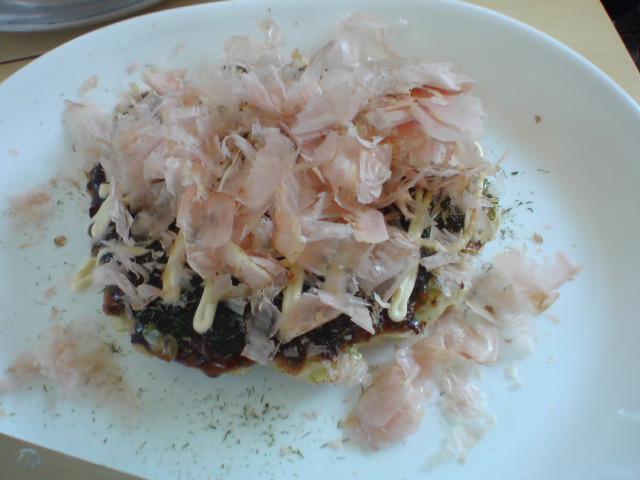 キャベツたっぷり、豚バラ、切りイカ、天かすetcとシンプル具材に鰹節をたっぷりのせて。