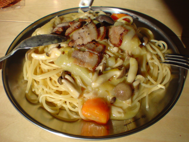 残り少なくなったクリームシチューに牛乳を入れて、翌日のお昼ゴハンはキノコとキャベツ
