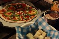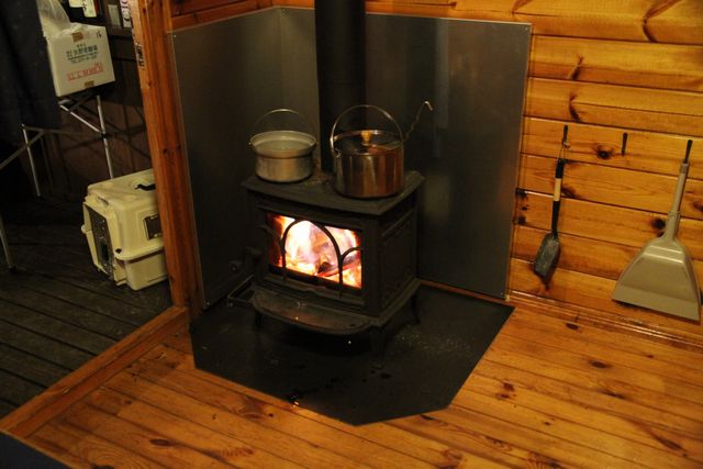 右:室内のストーブには五徳があって、ピザ用のフライパンをレンタル(500円)してキッチンペーパーを敷いて数分で出来上がり!