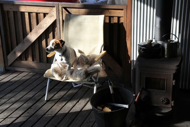 四郎もキャンプ用椅子に座ってお日様も当たってご満悦。
