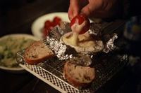 中心を丸く切り抜いたカマンベールを網であぶると中がトロトロに。