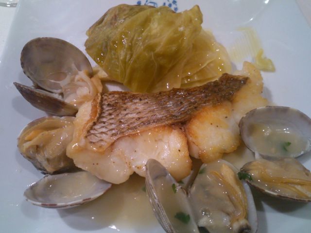 鯛をこんがり焼いて、春キャベツのグリルを添えてあさりのソース。