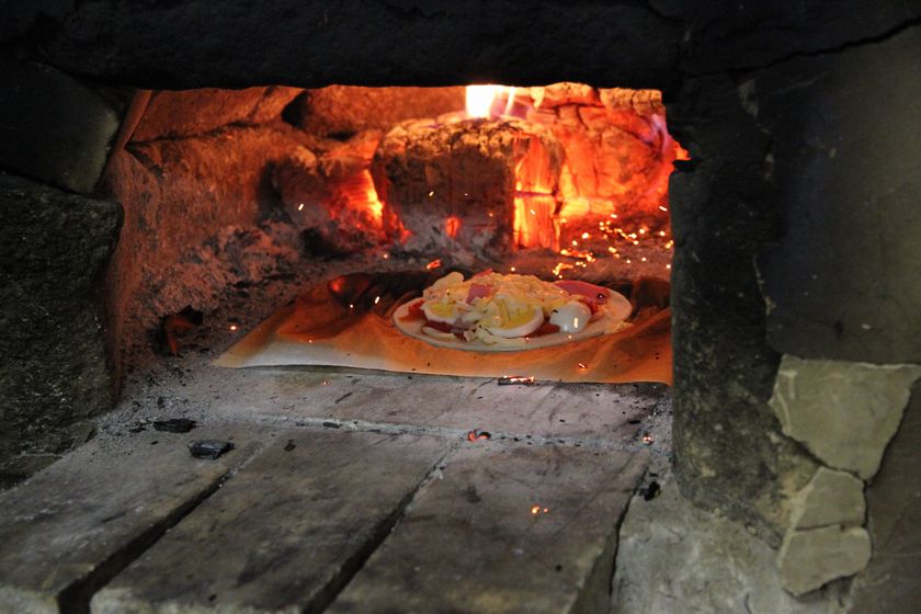 キャンプ場特製の石釜でピザ。