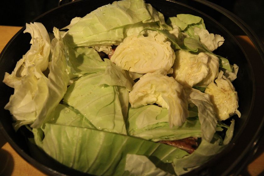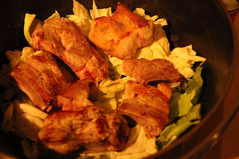 焼いたスペアリブの上にキャベツを並べて、、、