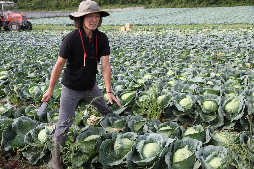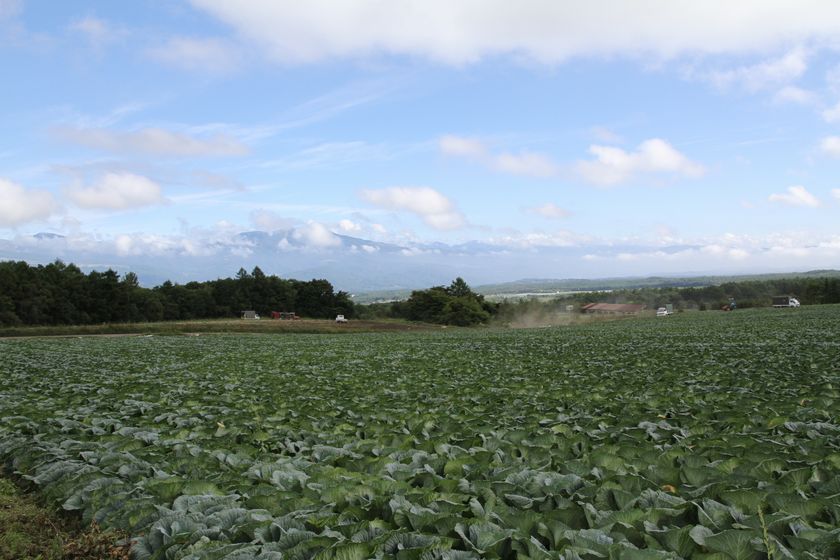 キャンプ場のスタッフ長谷部さんと、早朝キャベツ狩りへ。