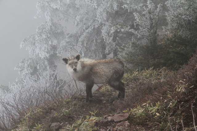 辺りを覆う一面の白霧のなか、切り立つ天空の城壁のような斜面に凛として頭を上げ、こちらを見ている。こちらの気配に全く動じることもない。それはこの世のものではない、神がかりを感じるような居住まいで立っている。