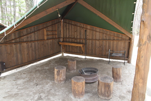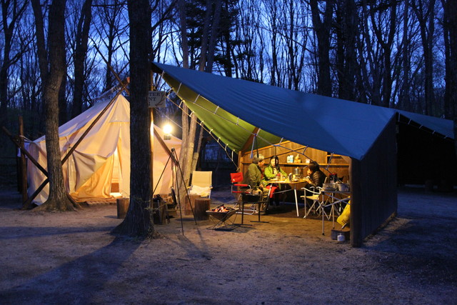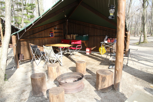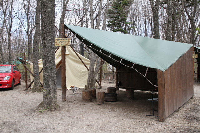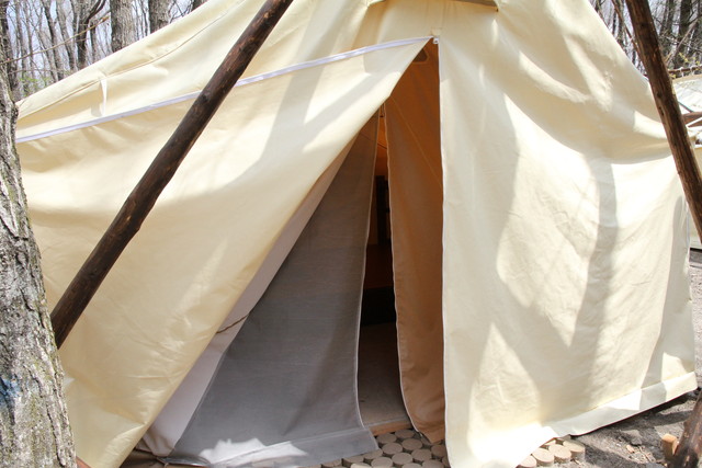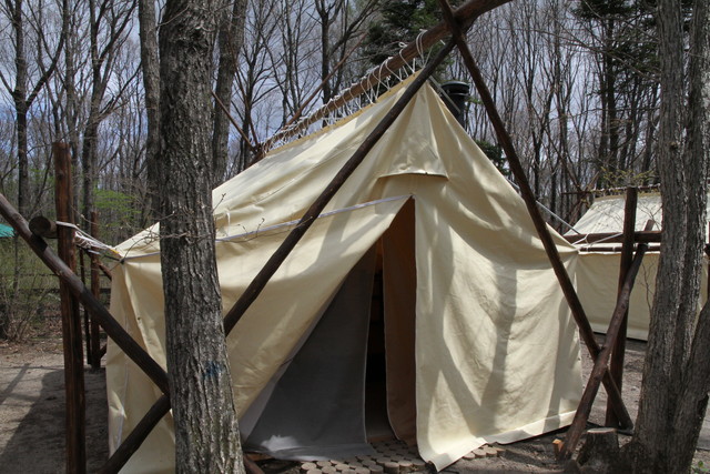 テントは、厚手のテント地を、切り出した檜の丸太で吊ったワイルドな造り。二重のスクリーンは、まだ寒さの残るこの時期、頼りになりそう。