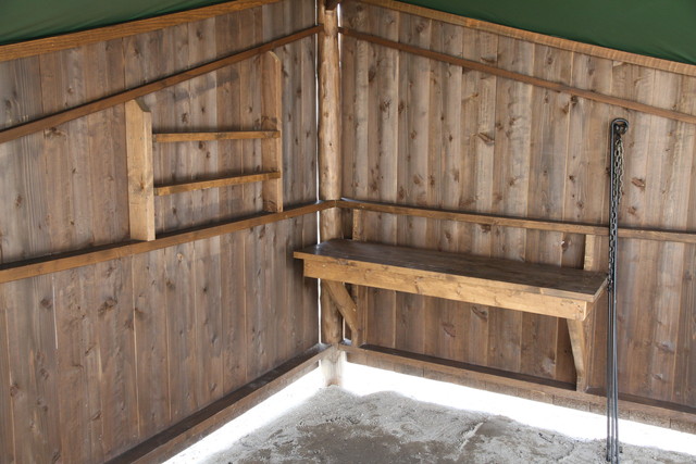奥にはテーブルがあつらえており、壁面にはちょっとした物をおける程度の棚が作ってある。ホイールのストーヴを跨いで置ける、高さ調節のできるグリル。ダッチオーブンなどを吊るす三脚台など、野趣に溢れる道具類も備え付き、見るからに楽しそう。そもそも普段、テント泊主体の僕らには、充分贅沢。