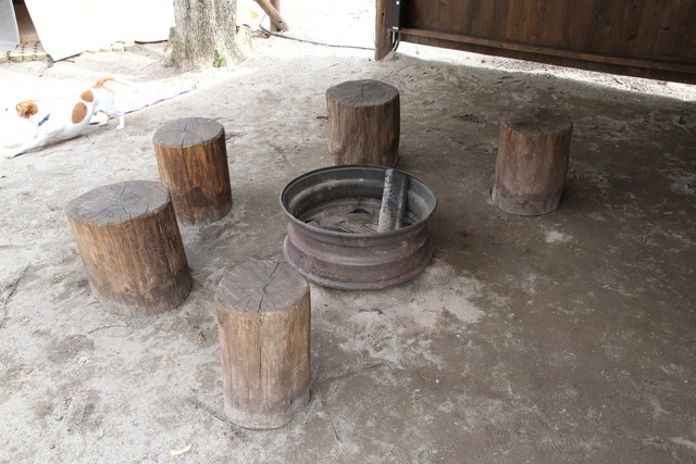 表の半屋根スペースには大型のタイヤホイールで作ったストーヴがあり、周りを切り株の椅子が囲んでいる。どんな過ごし方をするか、料理はどうしようか、団欒を過ごすのは・・思案が楽しいスペースとなっている。