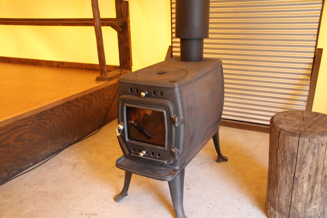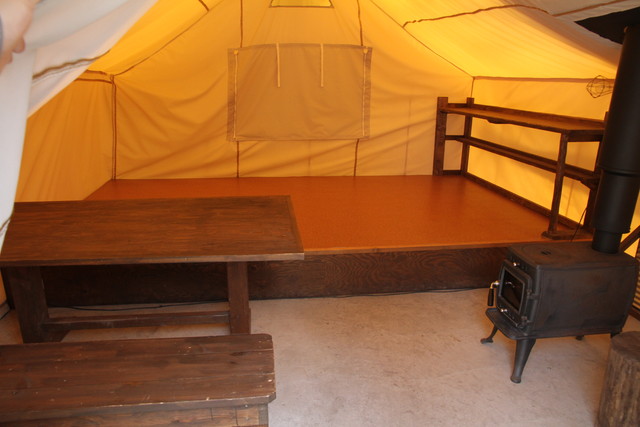 室内に入ってみると、かなり明るいせいか、テントと聞いて想像していたような閉塞感は全くない。手前の土間部分には4人掛けのテーブルセットと薪ストーヴがあり、小上がりの部分は大人4~5人がゆったり寝れるほどのスペースと荷物置きの棚がある。