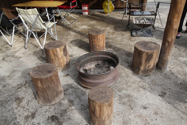 食器の片づけもそこそこに、丸太椅子コーナーに移動。ここのサニタリーの洗い場は、お湯が出るのでね、食器も軽く拭いておくくらいで大丈夫。これは楽チンだよね。