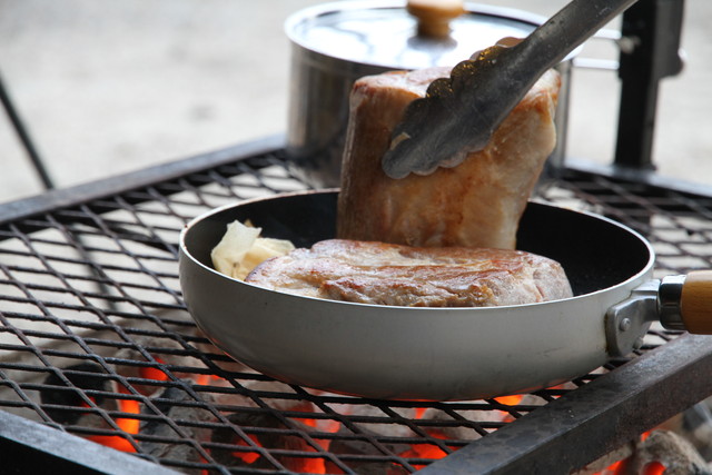 汁の滴る厚切り肉にかぶり付く、口いっぱいに頬張るのはね、木の匂いや夜露を運んで吹いてくる風の匂いを感じながらが一番、美味い。