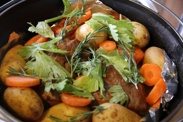 周りにはじゃがいも(これは小粒な新ジャガがgood)人参を敷き並べ、ローズマリー、パセリ、セロリなど香草を散らすと白ワインを1カップほど振りかけ、あとは上下中火で1時間ほどオーブンする。