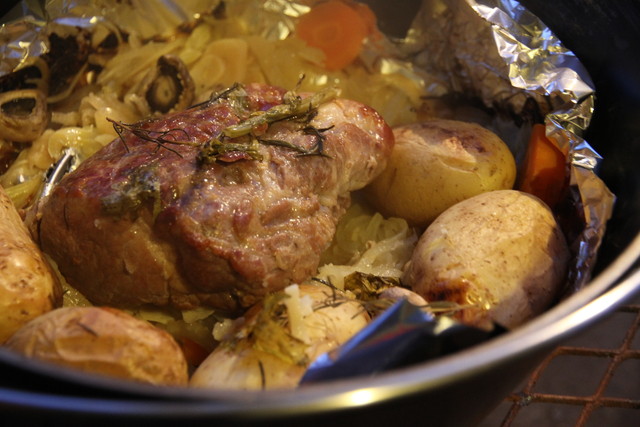 ダッチオーブンでは、塩豚のロースト。500gくらいの豚の肩ロースの塊を2個、塩の量は普通で、全体にまんべんなく擦り込み、今回は2日ほど冷蔵庫で寝かせて持参。玉ねぎはたくさん、5~6個。にんにくはこぶし大の一株をスライス。ネットで少し底上げしたアルミホイルの上にこれでもかと敷き詰め、表面に少しきつめに焼きを入れたロースの塊を並べる。