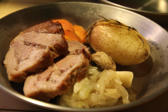 皿に、肉汁の滲み込んだタマネギ、にんにくを敷き、厚切りの塩豚を載せる。付け合せのじゃがいも、人参もちょうどいい具合に火が通って、火加減、時間ともどんぴしゃだね。