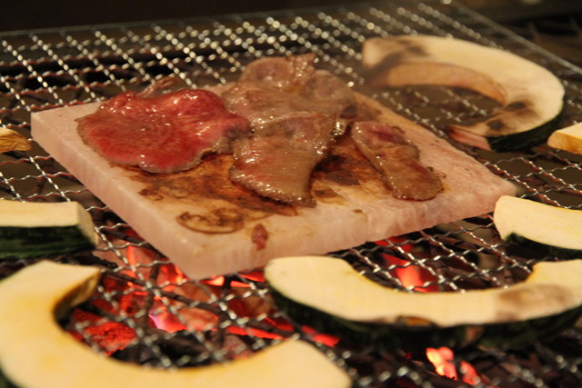 お腹もいい具合に膨らんできたけど、とどめとばかりに網の上に取り出したのは、ロゴスの岩塩プレート。これ、随分昔しからホームセンターなんかでも売ってるポピュラーな代物らしいんだけど、ついこの間、神輿仲間とのキャンプで見るまで全然知らなかった。エリンギとかね、いろんな野菜を載せて焼いても美味しいんだけど、やっぱ塩といったら、タンでしょ。上野松坂屋の肉屋さんで、気合とともに買ってきた上タン。焼き過ぎは絶対ダメ。犯罪。さっと表裏に火を通し、レモン汁でいただく。どんな山に登って、体をいじめようとも、こりゃ太る一方だね。