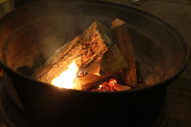 夜も更け、寒さも増してきたものだから、結局、火床をテント内の薪ストーヴへ移動、場所を移して暖をとることにした。