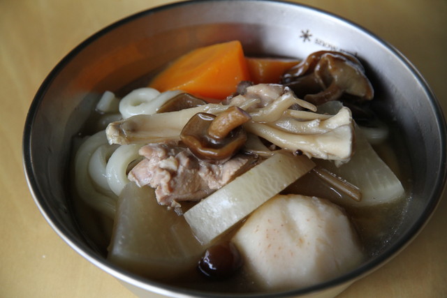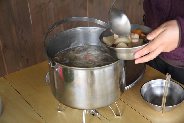 朝食は、夕べのキノコ汁の残りにうどんを入れたもの。ここはホイールストーブに炭の残りをそのままにして帰れるから、帰る日の朝も片付けを気にせず炭火を使える。