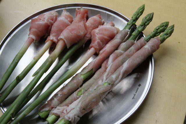 谷中生姜、アスパラに豚ロースを巻いて焼くだけ。