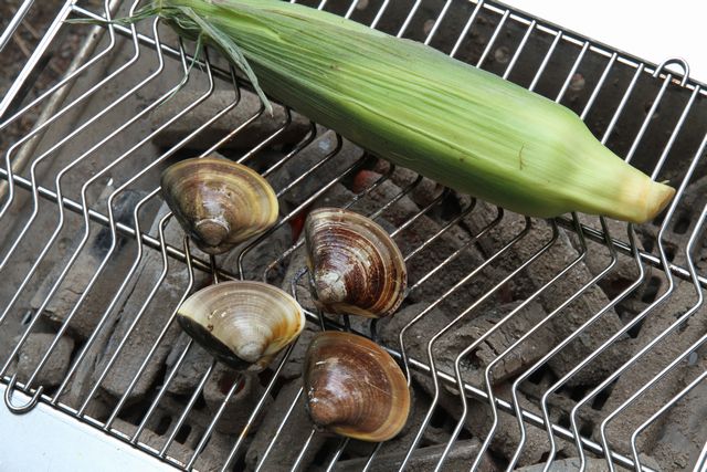 大きなハマグリ、生のとうきびを焼くだけー